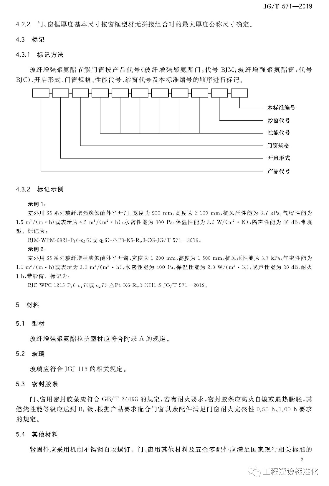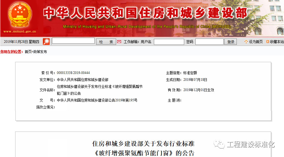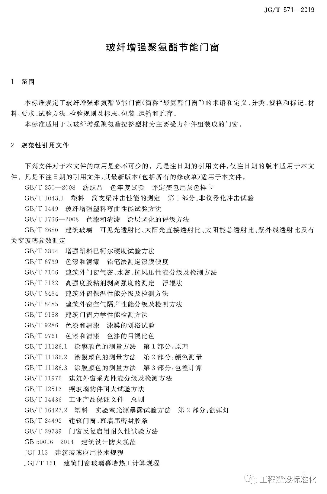 現(xiàn)批準《玻纖增強聚氨酯節(jié)能門窗》為建筑工業(yè)行業(yè)產(chǎn)品標準,編號為JG/T571-2019,自2019年12月1日起實施。