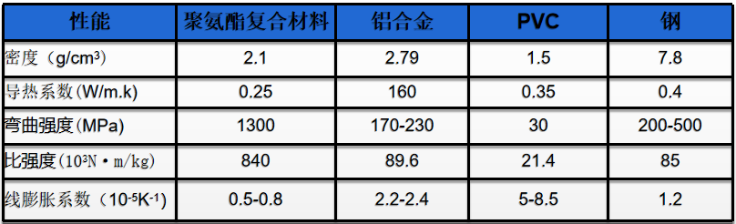 本型材密度小,比鋁合金輕25%左右 ,彎曲強(qiáng)度是鋁合金的5倍左右,超高的強(qiáng)度使得其型材截面比鋁合金小10%左右 ,大大提高視野的通透性。增強(qiáng)纖維大幅提升聚氨酯型材的強(qiáng)度、硬度和彈性模量(彎曲模量可達(dá)48GPa),無(wú)需襯入增強(qiáng)型鋼,就可實(shí)現(xiàn)穩(wěn)定的玻璃承載。